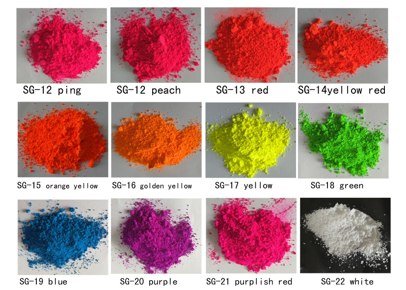 熒光粉具有鮮亮豔麗,著色力好,添加量少的特性,顔色有熒光粉紅,熒光桃紅,熒光橙紅,熒光大紅,熒光綠,熒光藍,熒光桔黃,熒光黃,熒光金黃,熒光紫,熒光紫紅,熒光白12個色。日光熒光顔料廣泛運用於塗料 油墨 印刷 塑料、檢漏、蠟燭、彩泥、等領域的工藝特點,及其在抗粘輥、耐溫、耐溶劑等性能方面的特殊要求.